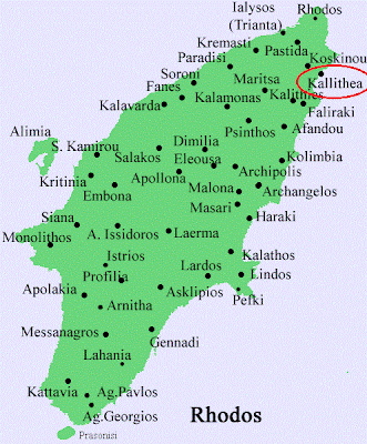 Karta över Rhodos. Kallithea som är markerad, där ska vi bo.
